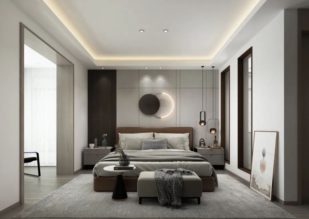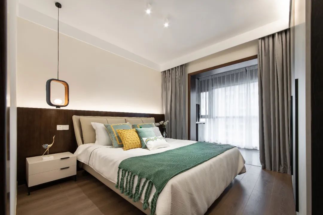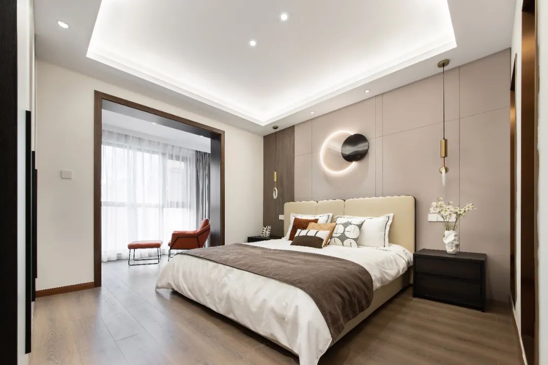 主臥用木紋、白、灰三色將整體空間串聯起來,保持全屋的統一基調;分色墻組合燈線,增添空間層次感的同時,又給了臥室獨有的小心機。