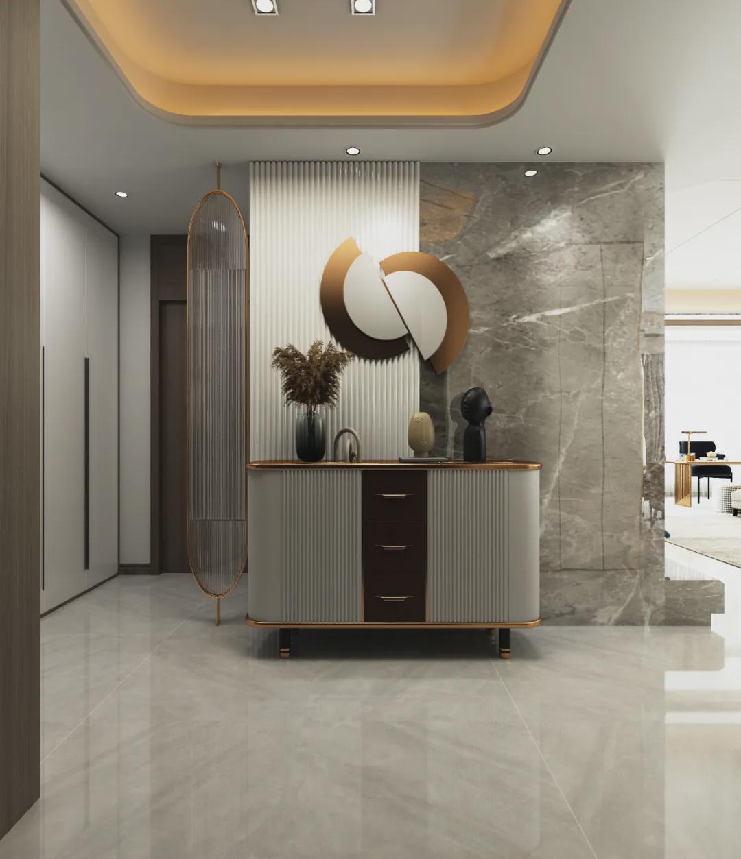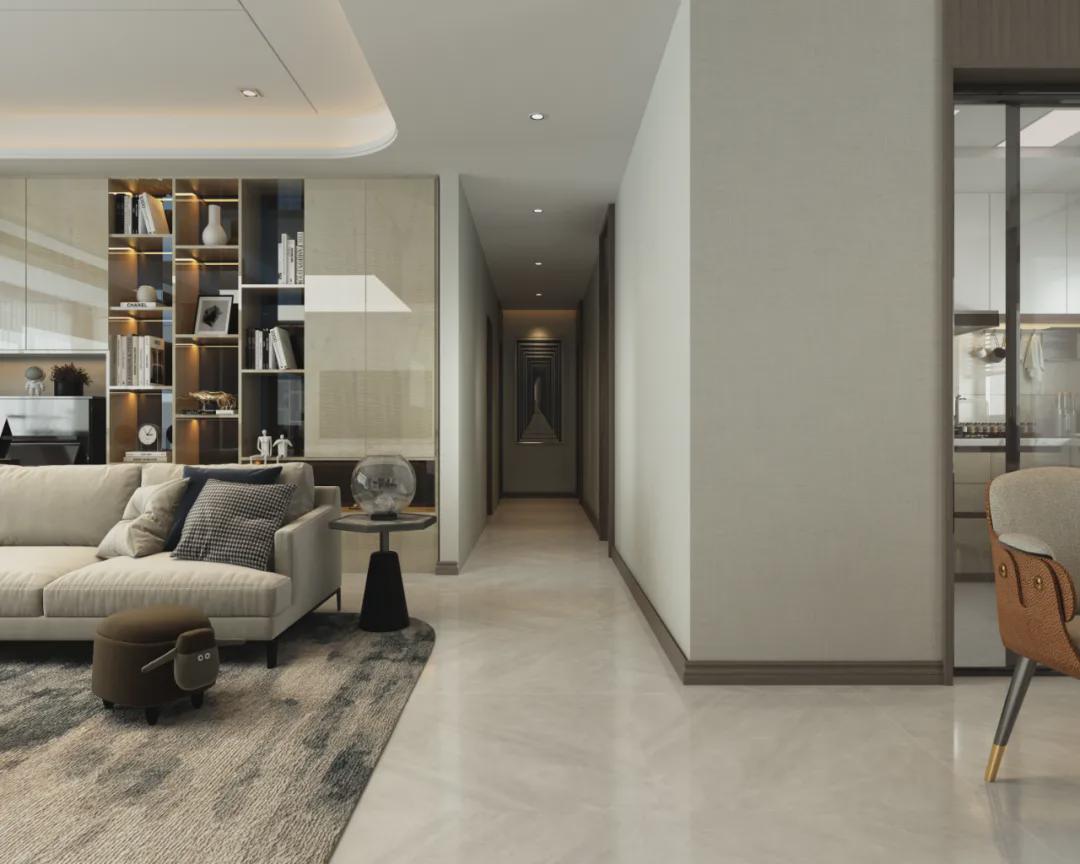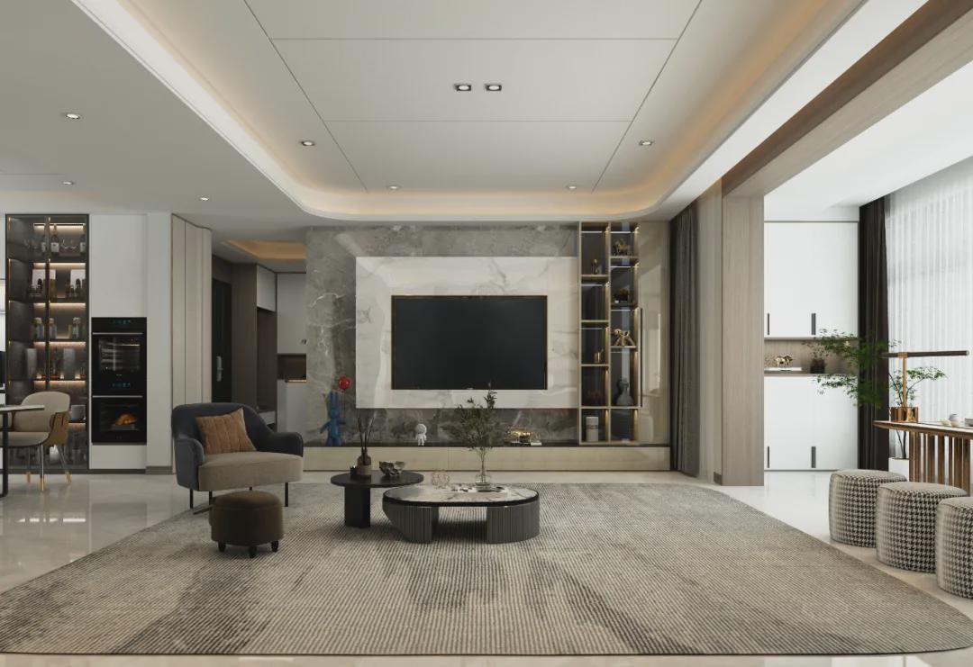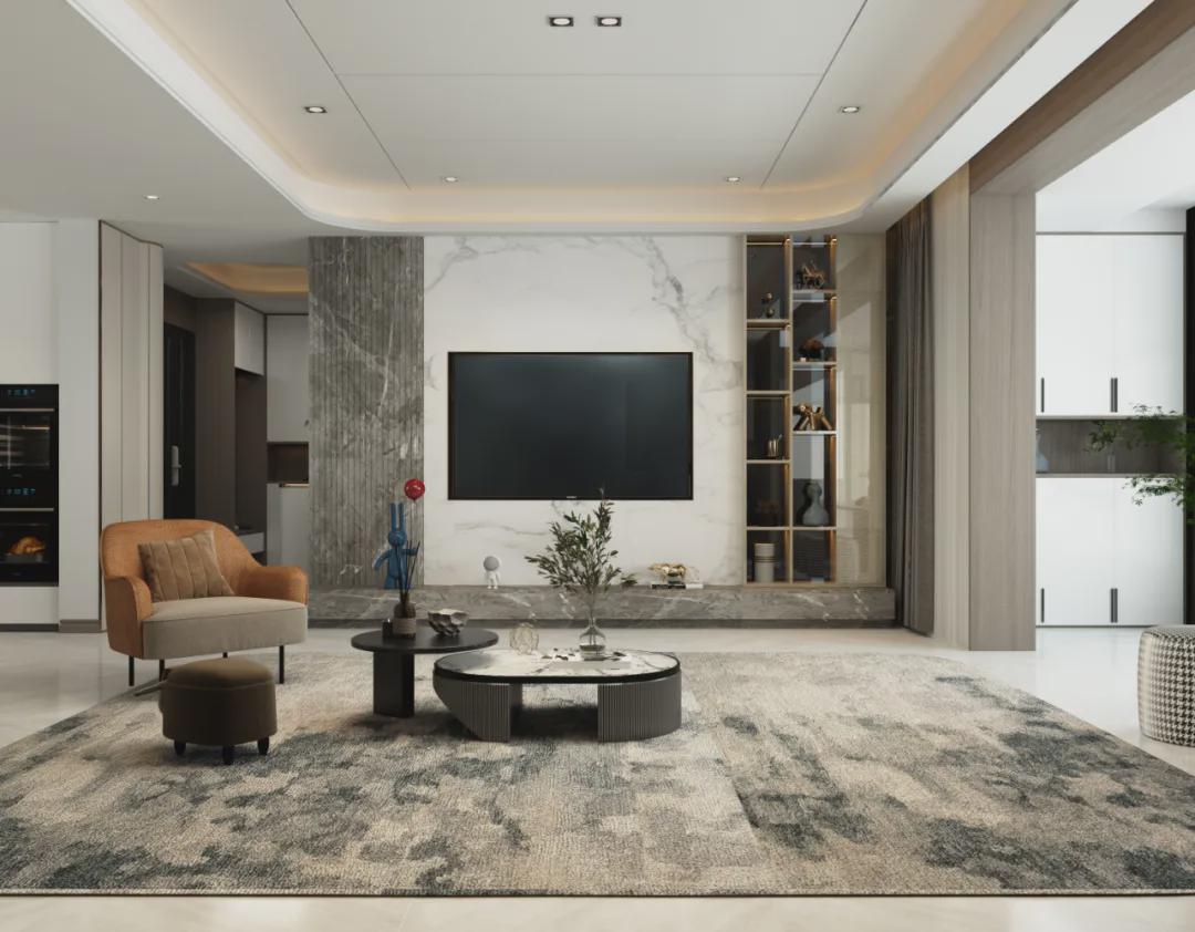 業主對于電視的要求不是很高,有簡易的觀影功能即可,顏值超高的石材背景墻電視正好適合;“節約”下來背景墻的空間,用裝飾柜+分縫造型詮釋空間層次感,結合隱形門設計,給空間不同維度的品質。