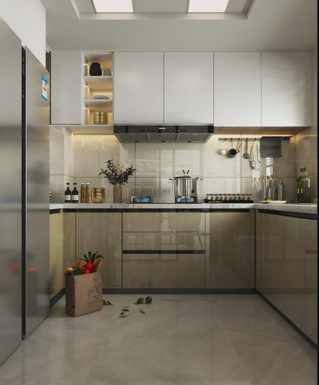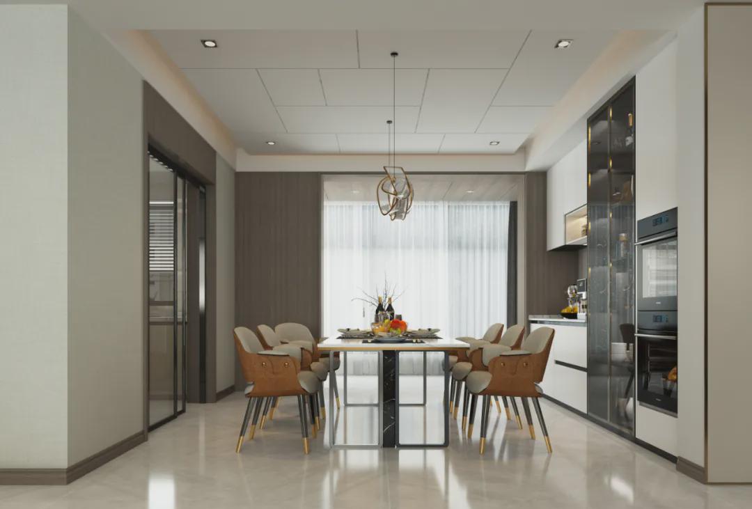 餐廳與客廳隔而不斷,保持距離相對獨立,自由卻有序。廚房和餐桌布局,豐富餐廳功能,給居住者更多選擇生活的方式;訴說著獨一無二無法輕易復刻的低奢質感!