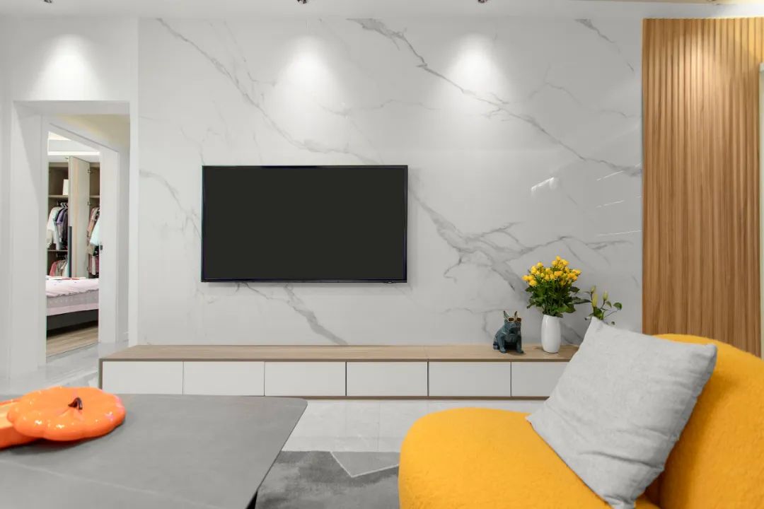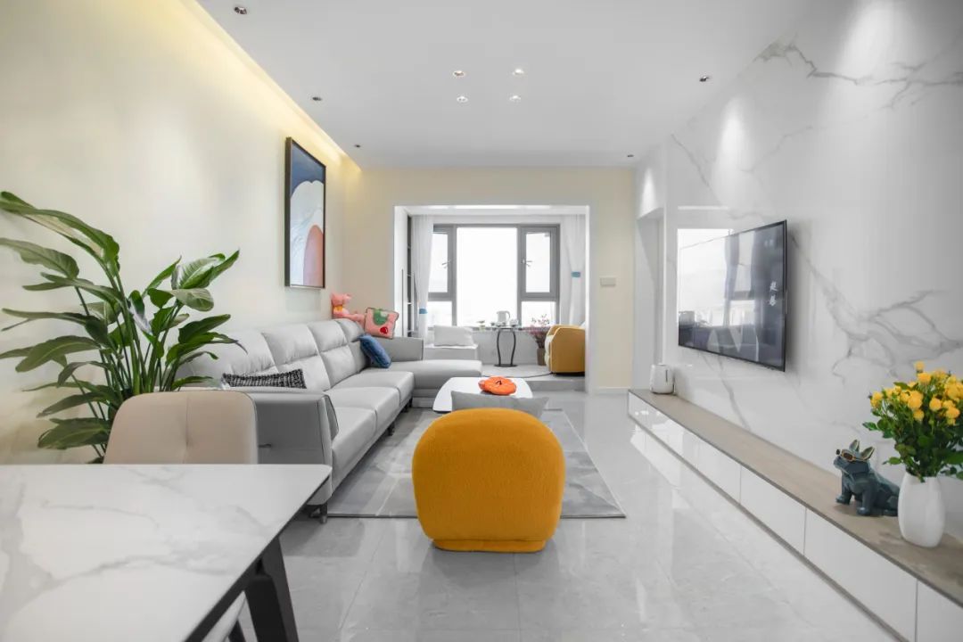 沙發搭配地毯,可以給女業主提供一個自由的休閑環境,躺在沙發,盤坐地毯上,怎么舒適怎么來。沙發背景墻設計左右分色,增強空間層次感,讓家不是單一的。